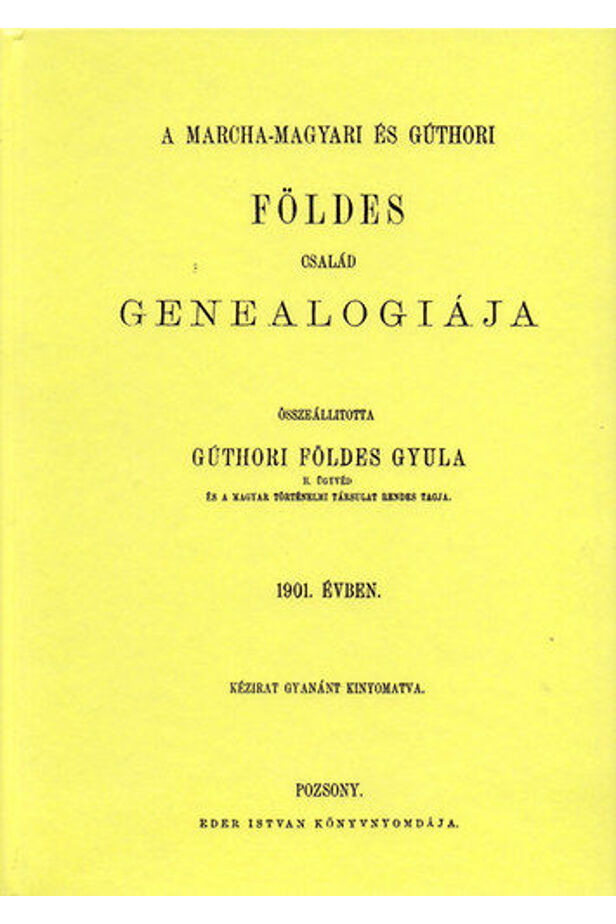 A marcha-magyari és gúthori Földes egy régi Pozsony megyei család, amely eredetét az 1500-as évek legelejéig vezeti vissza. A kötetben a család máig legteljesebb genealógiáját olvashatjuk. összeállította gúthori Földes Gyula. - Pozsony : [Szerző], 1901.